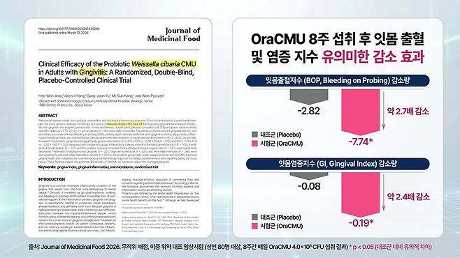 순환 염증과 관련된 단백질 중에서 섬유아세포 성장인자-5(fibroblast growth factor-5), 흉선 기질 림프구 생성인자(Thymic stromal lymphopoietin), 핵인자 카파비 리간드의 수용체 활성제/골보호단백질 비율(receptor activator of nuclear factor κB ligand/osteoproteogerin ratio)이 OraCMU 섭취군에서 대조군 대비 유의한 감소를 보였다. 특히 치주질환의 주요 원인균인 포르피로모나스 진지발리스(Porphyromonas gingivalis), 트레포네마 덴티콜라(Treponema denticola), 프리보텔라 인터미디아(Prevotella intermedia) 등 유해균은 유의미하게 감소하고 유익균인 Weissella는 유의하게 증가해 무너진 구강 생태계를 건강하게 복원하는 강력한 메커니즘을 증명했다.