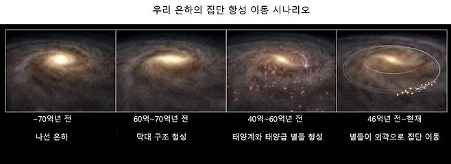 흥미로운 건 별들의 대이주가 지구 생명 탄생에도 결정적인 역할을 했을 수 있다는 점이다. 은하 중심부 근처는 초신성 폭발과 같은 격렬한 현상이 잦고 방사선이 강력해 생명체가 살기에 부적합한 환경이다. 별들의 밀도가 높아 별들의 공전 궤도가 불안정해질 위험도 크다. 연구진은 “태양이 좀 더 조용한 외곽 지역으로 옮겨온 덕분에 지구가 수십억년 동안 안정적인 궤도와 온화한 환경을 유지할 수 있었을 것”이라고 밝혔다. 태양계에 생명체가 살기 적합한 환경이 조성된 것은 우연이 아니라 은하 막대 구조 형성의 결과라는 얘기다.