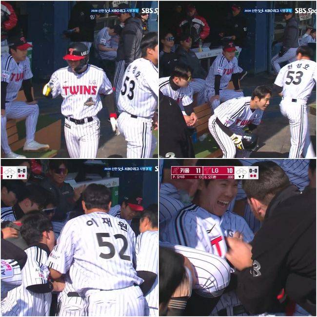 시범경기이지만 짜릿한 홈런 손맛을 본 강민균은 더그아웃에서 무관심 세리머니 이후 동료들의 격한 축하를 받았다.
