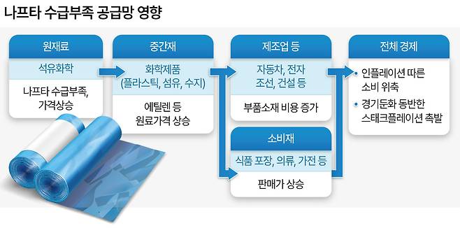 ▶업계 ‘4월 위기설’ 여전=나프타를 분해해서 만드는 에틸렌은 플라스틱과 합성수지 등 제조업의 거의 모든 제품에 들어간다. 이 같은 핵심 원료의 공급 절벽이 이미 현실화됐다. 국내 석화업체가 사용하는 나프타 절반은 국내 정유사에서, 나머지 대부분은 중동에서 들여오는데 물길이 막히며 물량 확보가 한계에 다다랐기 때문이다.