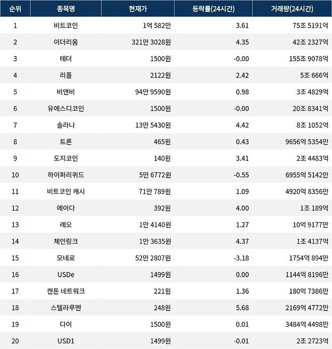 도지코인(DOGE)은 140원으로 24시간 동안 3.41% 상승했고 시가총액은 21조 6024억 원이다. 같은 시각 하이퍼리퀴드(HYPE)는 5만 6772원으로 0.55% 하락했다. 시가총액은 14조 5687억 원이다.