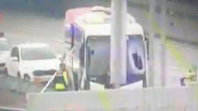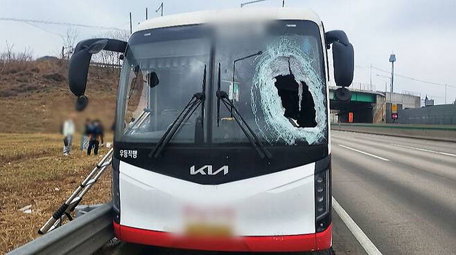 앞 유리창이 크게 파손된 버스 한 대가 고속도로를 위태롭게 달립니다. 중앙분리대를 한 번 들이받고 비틀거리더니, 차로를 넘어가다 속도가 조금씩 줄어듭니다.