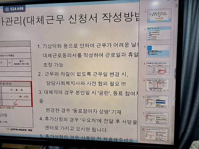 | ▲ 노인일자리 월례회의에서 근무자들의 휴가처리 지침이 세세히 안내됐다. |