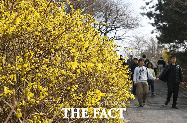 [더팩트 | 박상민 기자] 낮 최고기온이 17도까지 오른 24일 오후 서울 성동구 응봉산을 찾은 시민들이 개나리 옆을 지나고 있다.