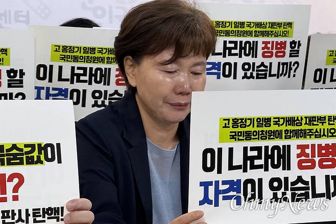 | ▲ 고 홍정기 일병(추서 계급 상병) 어머니 박미숙씨와 군 사망사건 유가족, 현역 장병 부모 모임, 군인권센터가 지난해 8월 20일 오전 10시 서울 마포구 군인권센터 사무실에서 '국가배상 항소심 재판부 탄핵 청원 개시' 기자회견을 열었다. 기자회견 중 박씨가 눈물을 흘리고 있다. |