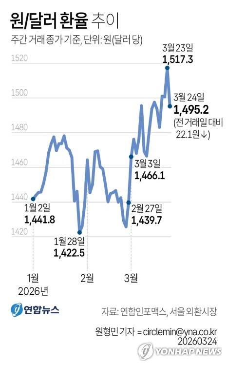(서울=연합뉴스) 원형민 기자 = 24일 서울 외환시장에서 미국 달러화 대비 원화 환율의 주간 거래 종가(오후 3시30분 기준)는 전 거래일보다 22.1원 내린 1,495.2원이었다.