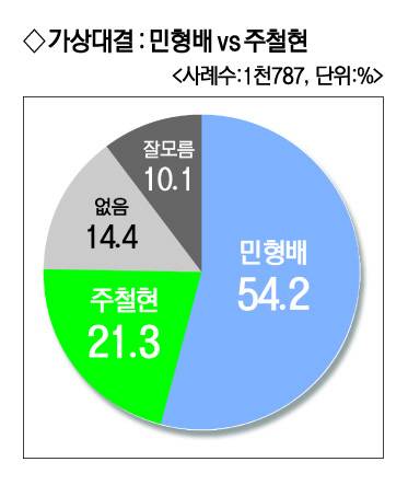 주철현 의원과의 가상 대결에서는 차이가 가장 크게 벌어졌다. 민형배 의원이 54.2%의 지지를 받았다. 주철현 의원은 21.3%에 그쳤다. 두 사람의 차이는 무려 32.9%p였다.