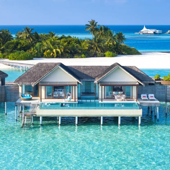 투명한 바다 위에 떠 있는 빌라에는 밝은 색감의 스타일리시한 가구들이 배치됐다. 무엇보다 인상적인 건 감각적인 하이테크 설비. 리모트 컨트롤러 버튼 하나로 에스프레소를 내리거나 팝콘을 즐기고, 다양한 엔터테인먼트를 이용할 수 있었다. 게으름과 휴식이 어울리는 여행자에게는 반가운 장치였다. 바닥부터 천장까지 이어진 유리문을 통해 오션뷰가 펼쳐진다. 문을 열고 나가면 프라이빗 수영장 위에 플로팅 조식을 띄워 여유를 만끽할 수도 있다.