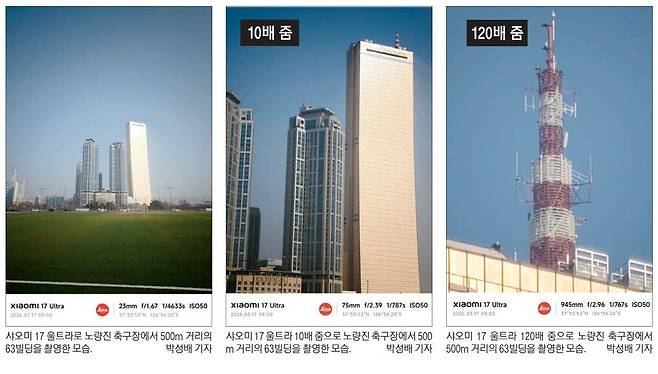 스마트폰 카메라를 켜고 화면을 밀어가며 배율을 높이자 멀리 있던 63빌딩 옥상이 시야 안으로 성큼 들어왔다. 노량진 축구장에서 대략 500m 떨어진 건물을 당겨보는 경험은 단순히 "줌이 된다"는 설명으로는 부족했다. 손안의 스마트폰이 순식간에 작은 망원경처럼 느껴졌다.
