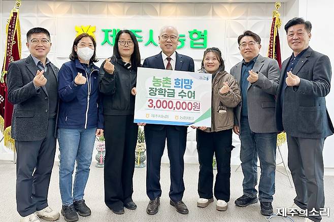 제주시농협(조합장 고봉주)은 23일 본점에서 지역 인재 육성과 농촌 다문화가정의 안정적인 정착 지원을 위한 '농촌 희망장학생 장학금 수여식'을 열었다.