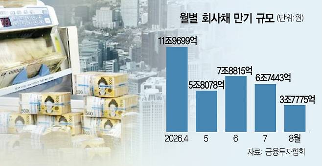24일 금융투자협회에 따르면 다음 달 만기가 돌아오는 회사채 규모는 11조 9699억 원에 달한다. 이는 올해 1월(11조 4366억 원)과 2월(12조 6285억 원)에 이어 3번째로 큰 수준이다.