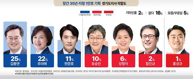 24일 중부일보 의뢰로 여론조사기관 ㈜엠브레인퍼블릭이 경기도 거주 만 18세 이상 남녀 800명을 대상으로 지난 23일 오후 1시부터 오후 8시 40분까지 실시한 여론조사 결과(95% 신뢰수준에 오차범위 ±3.5%p)에 따르면 '오는 6월 경기도지사 선거에서 누가 가장 적합하다고 생각하는가'에 대한 물음에 김동연 경기도지사는 25%, 추미애 의원은 22%의 지지를 얻었다.