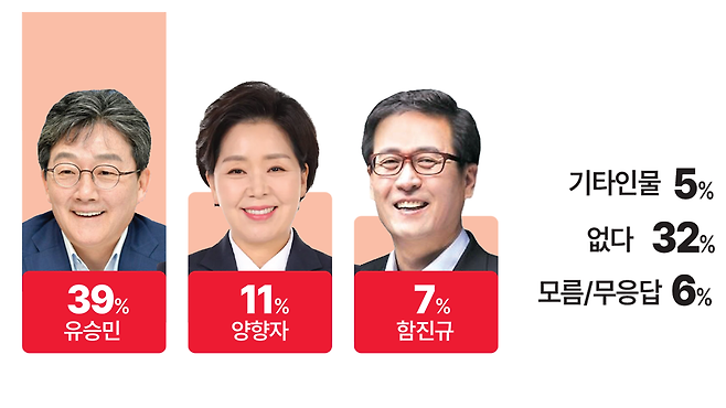 24일 중부일보 의뢰로 여론조사기관 ㈜엠브레인퍼블릭이 경기도 거주 만 18세 이상 남녀 800명을 대상으로 지난 23일 오후 1시부터 오후 8시 40분까지 실시한 여론조사 결과(95% 신뢰수준에 오차범위 ±3.5%p)에 따르면, 응답자 39%가 유승민 전 국회의원을 선택했다. 양향자 국민의힘 최고위원은 11%를 얻으면서 두 인물의 차이는 오차범위 밖인 28%p인 것으로 확인됐다.