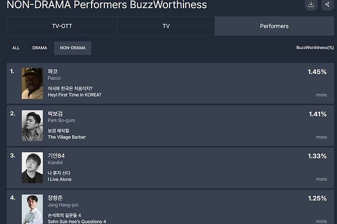 파코가 '어서와 한국은 처음이지?' 프로그램을 통해 출연자 화제성 1위에 올랐다.