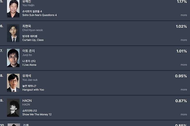 9위는 '쇼미더머니12'의 HAON으로, 해당 프로그램의 출연자가 TOP10에 오른 것은 이번이 처음이다.
