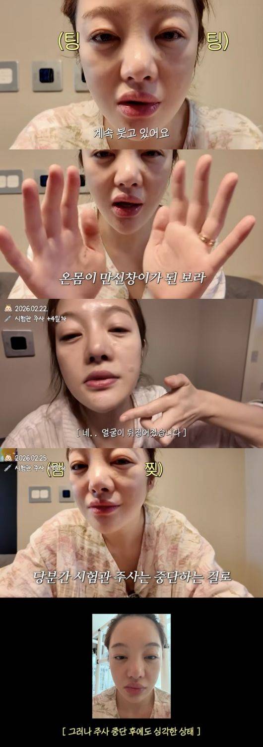 이후 황보라는 “제가 지금 그 주사를 맞은 지 일주일이 지났는데 계속 붓고 있다. 만신창이다. 임파선도 엄청 부었다”라고 설명했다. 황보라는 얼굴이 퉁퉁 붓고 손도 부은 모습이었으며 멍으로 가득한 배를 공개하기도 했다.