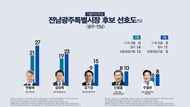 강기정 광주시장 15%, 신정훈 국회 행정안전위원장 10%, 주철현 전 민주당 최고위원 8%로 집계됐고, 지지후보가 없다는 11%, 모름이나 무응답은 5%였습니다.
