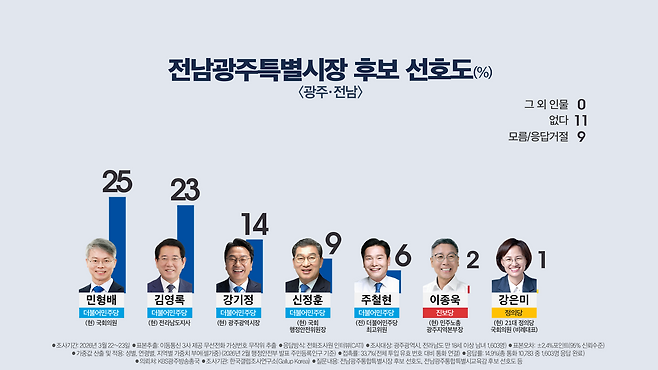 민형배 국회의원 25%, 김영록 전남도지사 23%, 강기정 광주시장 14%, 신정훈 국회 행정안전위원장 9%, 주철현 전 더불어민주당 최고위원 6%, 이종욱 민주노총 광주지역본부장 2%, 강은미 전 국회의원 1% 등으로 나타났습니다.