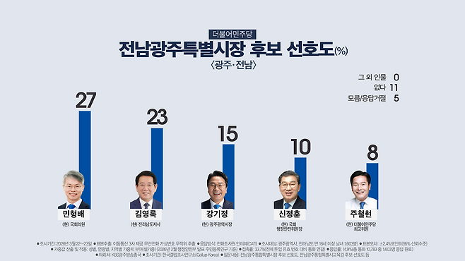 민형배 국회의원 25%, 김영록 전남도지사 23%, 강기정 광주시장 14%, 신정훈 국회 행정안전위원장 9%, 주철현 전 더불어민주당 최고위원 6%, 이종욱 민주노총 광주지역본부장 2%, 강은미 전 국회의원 1% 등으로 나타났습니다. 지지 후보가 없다는 응답은 11%, 모름이나 무응답은 9%였습니다.