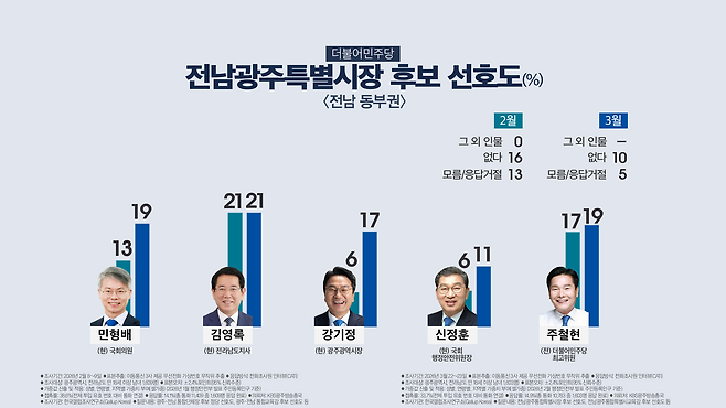 전남 동부권의 경우 지난 2월 조사에서는 강기정 시장이 6%를 얻는 데 그쳤지만, 이번 조사에서는 17%로 올라섰습니다. 전남 국립의대 입지와 관련해 강 시장이 동부권인 순천을 강하게 주장한 것이 영향을 미친 것으로 분석됩니다.