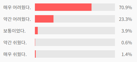 응시생 체감 난이도는 ‘매우 어려웠다(70.9%)’, ‘약간 어려웠다(23.3%)’, ‘보통이었다(3.9%)’, ‘약간 쉬웠다(0.6%)’, ‘매우 쉬웠다(1.4%)’ 순으로 집계됐다.