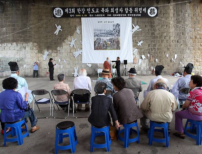 | ▲ 평화재향군인회와 한국전쟁유족회가 2009년 6월 28일 오전 서울 한강대교 아래 노들섬 부지에서 한강 인도교 폭파 희생자 합동 위령제를 올리고 있다. 한국전 발발 이틀 후인 1950년 6월 28일 새벽 수많은 피난민이 한강 인도교 남하 이동 중 예고없이 다리가 폭파됨에 따라 500~800명의 희생자가 발생했다. |