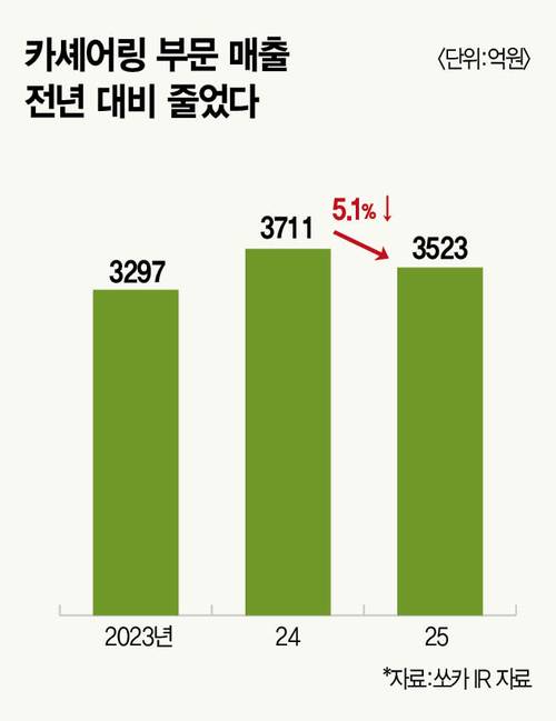 지난해 쏘카 실적을 살펴보자. 이익은 늘었지만 핵심 사업 매출은 오히려 줄었다. IR 자료에 따르면, 지난해 카셰어링 부문 매출은 3523억원이다. 전년(3711억원) 대비 5.1% 감소했다. 카셰어링 매출이 전년 대비 줄어든 것은 이번이 처음이다. 2022년과 2023년에는 각각 6%, 7.5% 증가했고 2024년에도 12.6% 늘었다.