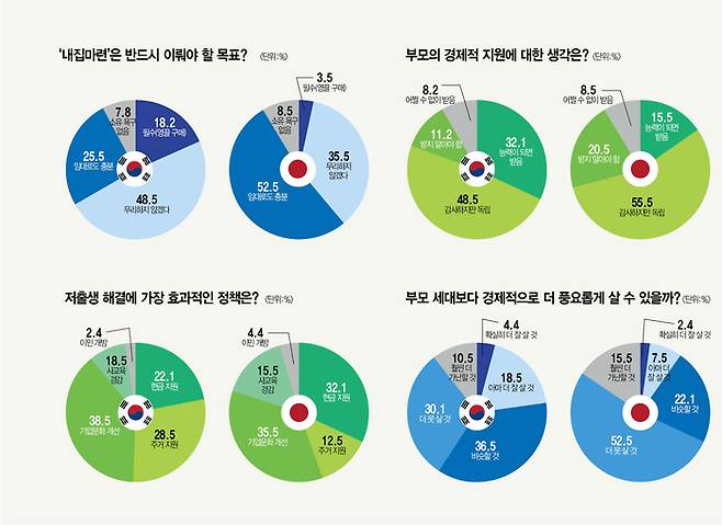 주거 인식과 자산 증식을 대하는 태도에서 양국 청년은 정반대 행보를 걷는다. 한국 청년은 무리한 대출을 해서라도 아파트를 필수 구매해야 한다는 응답이 18.2%를 차지했다.