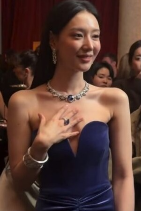 화려한 다이아몬드와 블루 사파이어가 세팅된 목걸이, 귀걸이, 팔찌를 착용했음에도 불구하고 주얼리보다 더 빛나는 미모가 시선을 압도한다.