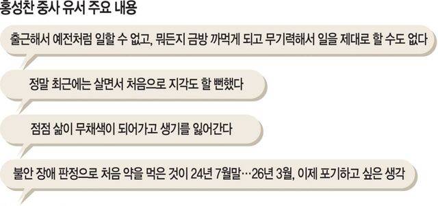 국민일보가 24일 홍 중사의 정신과 진료기록과 유가족, 지인을 취재한 결과 그는 2024년 해당 부대에 전입한 뒤 그해 중순부터 증상이 심화된 것으로 보인다. 첫 방문 당시 그의 진료기록부에는 “두 달 전쯤부터 울음이 멈추지 않고 우울감이 지속되면서 증상이 심해졌다”고 기록돼 있다. 홍 중사를 가까이서 지켜본 이들은 밝고 음악을 좋아하던 그가 2024년쯤부터 부대 환경에 적응하지 못하며 급격히 증상이 악화했다고 전했다.