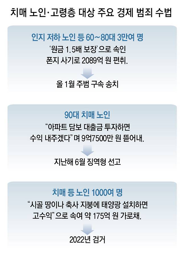 특히 이들은 전국 35개 지사를 두고 투자자를 모으는 등 기업형 범죄 조직의 모습을 보였다. 유명 가수를 동원해 사업 설명회를 열기도 했다. 경찰 관계자는 “치매 환자를 비롯한 고령층의 자산을 빼돌리는 가해자가 지인이나 가족 등에 그치지 않고 ‘조직화’할 수 있다는 점을 보여 주는 사례”라고 말했다.