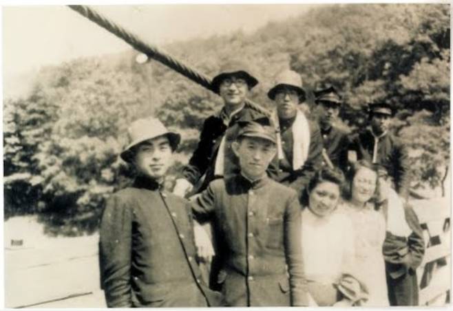 | ▲ 아마가세 구름다리 위의 윤동주시인 아마가세 구름다리. 1943년 윤동주 시인(사진 왼쪽에서 2번째)이 우지에 소풍을 와서 벗들과 기념사진을 촬영한 장소이다. 그해 7월 윤동주는 치안유지법 위반으로 체포되고 징역 2년형을 선고받은 뒤 수감중이던 후쿠오카 형무소에서 1945년 2월 16일 숨을 거둔다. 이 사진은 윤동주 시인의 최후 사진이 되었다. |
