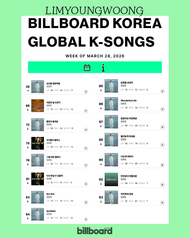 ‘핫 100’에서는 ‘순간을 영원처럼’이 2위를 기록했다. 이어 ‘사랑은 늘 도망가’가 9위, ‘들꽃이 될게요’가 10위에 자리했다. 여기에 ‘그댈 위한 멜로디’ 11위, ‘우리들의 블루스’ 12위, ‘비가와서’ 13위까지 상위권에 고르게 포진해 임영웅 음악의 저력을 보여줬다.