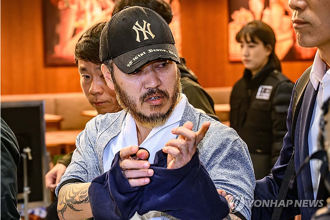 남색 야구 모자에 수염을 기른 박왕열은 오전 7시 16분께 인천국제공항 출국장을 빠져나왔다. 팔에는 문신이 드러났고 담담한 무표정이었다.