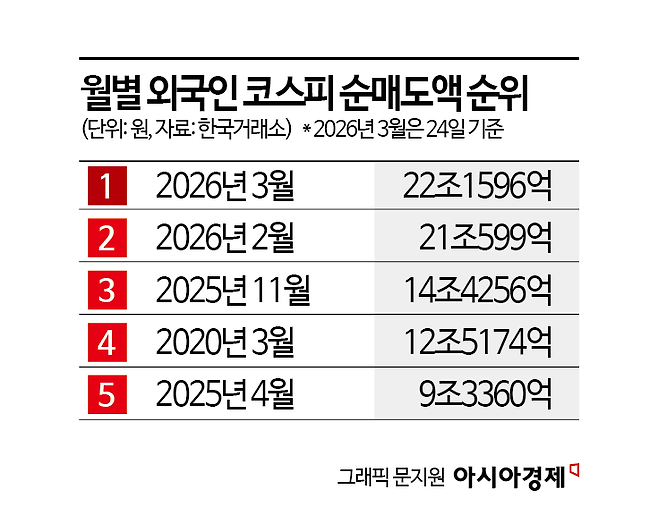 중동전쟁 이후 국제유가와 시장금리가 급등하면서 중동산 원유 수입 의존도가 높은 한국 시장의 취약성이 부각된 것이 외국인 투자자들의 투매 원인으로 꼽힌다. 그간 코스피가 다른 나라 증시에 비해 상승폭이 높았는데 중동전쟁을 빌미로 차익실현에 나섰다는 분석이다. 외인들은 특히 삼성전자와 SK하이닉스 등 올해 들어 주가가 큰 폭을 뛴 대형주를 중심으로 주식을 팔고 있다. 외국인 투자자들은 이달에만 삼성전자를 10조5390억원 순매도하며 가장 많이 팔았다. SK하이닉스도 3조9920억원 팔며 2번째로 많이 순매도했다.
