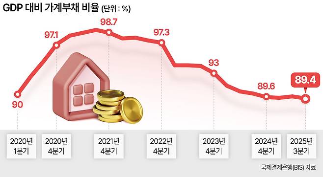 ![GDP 대비 89%에 달하는 가계부채 비율을 2030년까지 80%로 끌어내리기 위한 범정부 차원의 감축 목표 공식화가 추진되고 있다. 대통령실을 중심으로 금융·부동산·세제 정책을 총망라해 가계부채 관리를 강화한다. [연합]](https://img4.daumcdn.net/thumb/R658x0.q70/?fname=https://t1.daumcdn.net/news/202603/25/ned/20260325103146966sgqw.jpg)