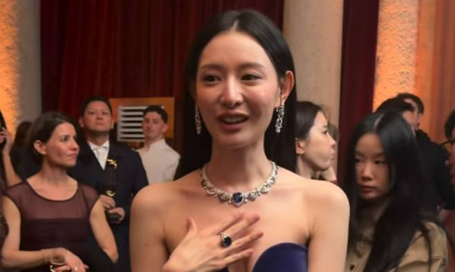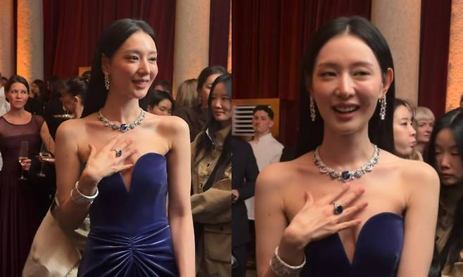 이날 김지원은 깊은 블루 컬러의 튜브톱 드레스에 화려한 하이 주얼리를 매치해 우아하면서도 독보적인 아우라를 뽐냈다.