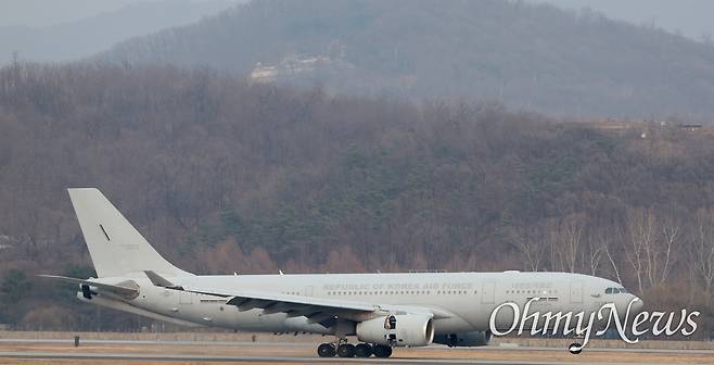 | ▲ 15일 오후 경기 성남 서울공항에서 중동 상황 악화로 현치 체류 교민이 탑승한 공군 다목적 수송기 KC-330 '시그너스'가 도착하고 있다. |