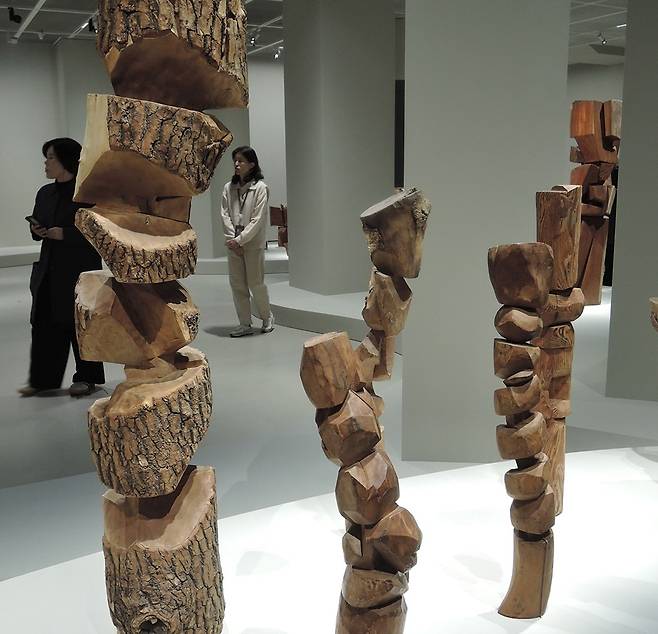 | ▲ '합이합일 분이분일' 팔로 산토(Palo Santo) 나무 181.3×51.4×44.1cm 1987-1988 미국 뉴욕 구겐하임미술관 소장품. 작품에 선 김윤신 작가. |