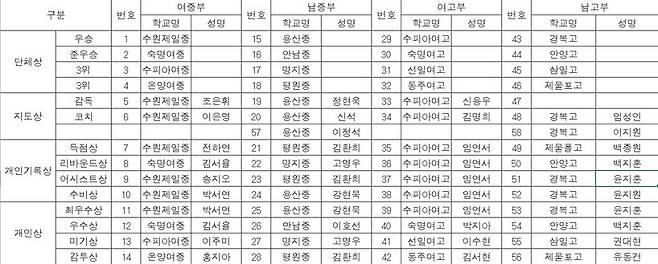 모든 경기가 끝난 뒤 진행된 시상식에서는 용산중 강현묵, 수원제일중 박서연, 경복고 윤지훈, 수피아여고 임연서가 최우수 선수로 선정됐다.
