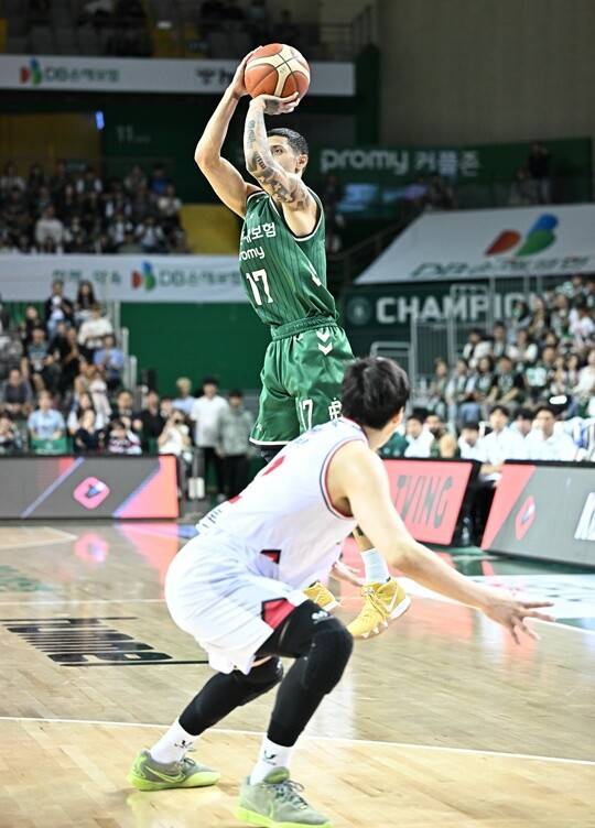 김영현이 제대로 붙었다. 그렇지만 DB의 스크린에 한 발 늦게 반응했다. 알바노에게 또 한 번 3점을 내줬다. 원주DB프로미아레나의 데시벨을 높이고 말았다.