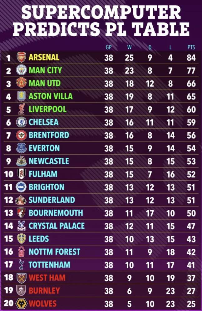 1위는 아스널이었다. 이 뒤를 맨체스터 시티, 맨체스터 유나이티드, 아스톤 빌라, 리버풀, 첼시가 잇는 것으로 예측됐다.