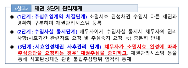 이에 금감원은 지난 2023년 10월 간담회 당시 전달했던 소멸시효 채권 3단계 관리체계에 소멸시효 완성 채권에 대한 추심 중지 내용을 보완해 재전달했습니다.