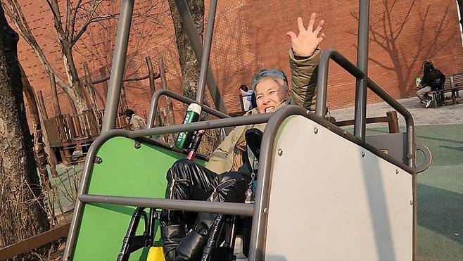 ▲ 서울 혜화역 지하철 선전전을 하고 돌아가는 길. Moon이 마로니에 공원의 휠체어 그네를 타고 있다. 집에만 있다가 25살에 사회에 나온 Moon은 아직 그네 타는 걸 좋아한다. “물리적 나이는 50대지만, 사회적 나이는 20대예요. 사회적 시간은 집을 나와야 흐르더라고요. 그래서 내 안에는 20대의 나와 50대의 내가 같이 있어요.” 20대의 Moon에게 스쿠버 다이빙은 시작에 불과하다. (사진 제공-호미) |