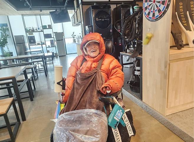 ▲ 제주에 풍랑주의보가 내려 매서운 바람에 눈까지 흩뿌린 날. 장애인 콜택시가 잡히지 않아 숙소에서 잠수풀장까지 25분 거리를 걸어 다녔다. 다리를 담요로 덮고 비닐로 감쌌다. (사진 제공–호미) |