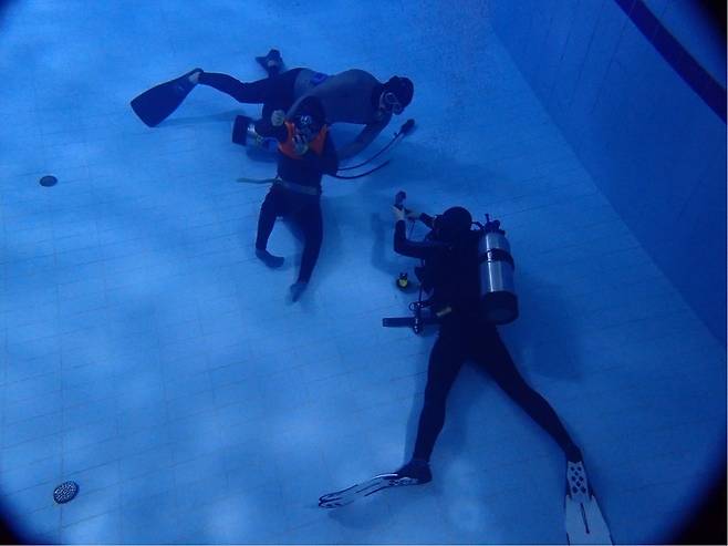 ▲ 이퀄라이징(귀의 압력 균형 잡기)과 호흡을 해가며 기어코 5미터까지 내려간 Moon과 Moon에게 끊임없이 물으며 지원해주는 감태 씨, 본인도 초보인데도 늠름히 촬영하는 방준식 감독... 세 사람의 모습이 놀랍고 아름다웠던 이유는 ‘돌봄 시민성’의 압축적 장면이기 때문일 것이다. (사진-호미 제공) |