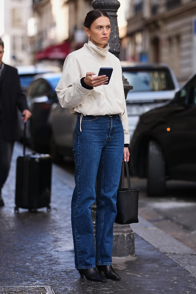 청바지는 캐주얼, 하이힐 은 포멀이라는 고정관념은 이제 내려놓아도 좋습니다. 두 아이템을 함께 매치했을 때 오히려 더 세련된 결과가 만들어지기도 합니다. 하이웨이스트 데님에 크롭 재킷을 더해 자연스러운 아워글라스 실루엣을 연출해보세요. 여기에 힐이 있는 부츠를 더하면 전체적인 비율이 한층 더 살아납니다. 특히 데님 밑단 아래로 살짝 드러나는 포인티드 토 부츠는 룩에 날카로운 포인트를 더해주죠. 힐의 높이는 취향에 따라 선택하되, 핵심은 전체적인 균형이라는 사실을 잊지 마세요.