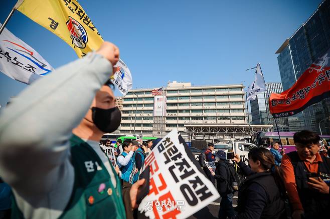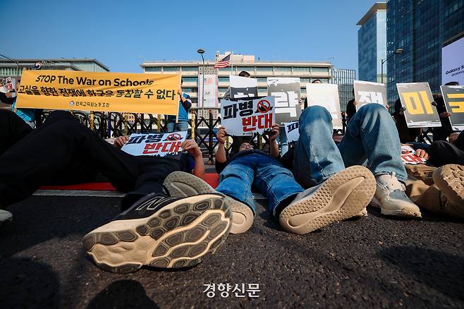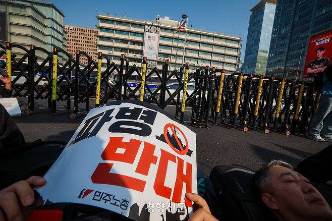“파병 반대”…미 대사관 앞에 드러누운 민주노총 [현장 화보]