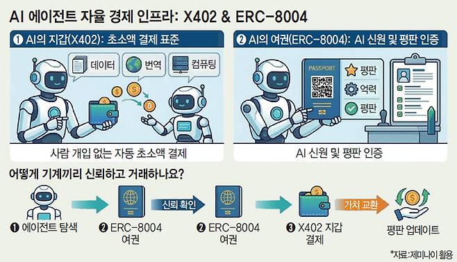 X402와 ERC-8004에 주목해야 하는 이유는 기계가 사람 승인 없이 스스로 경제 활동을 하도록 돕는 인프라라는 데 있다. 비유하자면 해외여행을 갈 때 챙겨야 하는 지갑과 여권이다. 윤석빈 서강대 AI·SW 대학원 특임교수는 “X402는 AI 결제 카드 역할을 하는 지갑이고, ERC-8004는 AI 능력과 과거 이력을 위조 불가능하게 증명하는 신분증 겸 이력서”라고 설명했다.
