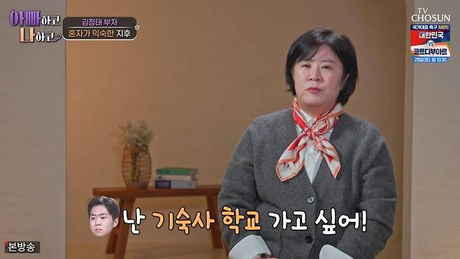 이에 김정태는 “고등학교 기숙사에 가면 더 혼자 있기 힘들다. 기숙사에 들어가면 매일 친구들과 함께 지내야 한다”며 걱정을 드러냈다. 김정태의 아내는 인터뷰에서 “아들이 초등학교 2학년 때부터 코딩을 오래 해왔다. 그쪽으로 재능이 있어 특수목적고를 알아보게 됐다”며 “지후가 기숙사 학교에 가고 싶어 한다. 미국 친구들이 기숙사에서 생활하는 모습을 동경하는 것 같다”고 전했다.
